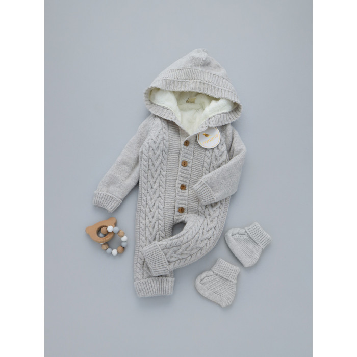 Комбінезон вʼязаний утеплений (Natural Wool) та пінетки Сірий косичка широка 62 (3-6міс)