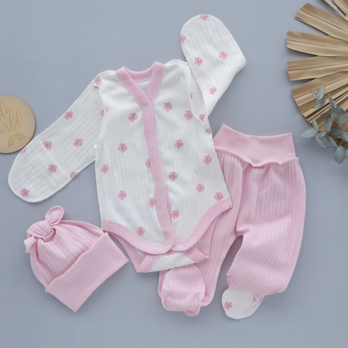 Набір 3в1: Боді, повзунки та шапочка Квіти Рожевий (Рубчик) 56 (0-3міс)