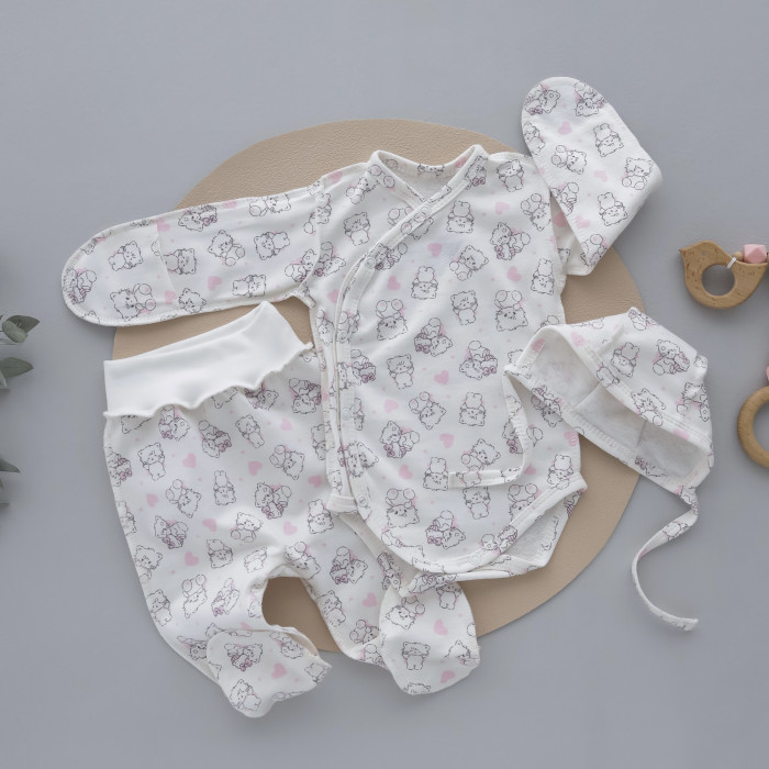 Набір 3в1: Боді, повзунки та шапочка на зав’язках Котики Рожевий (Футер - з начосом) 56 (0-1міс)