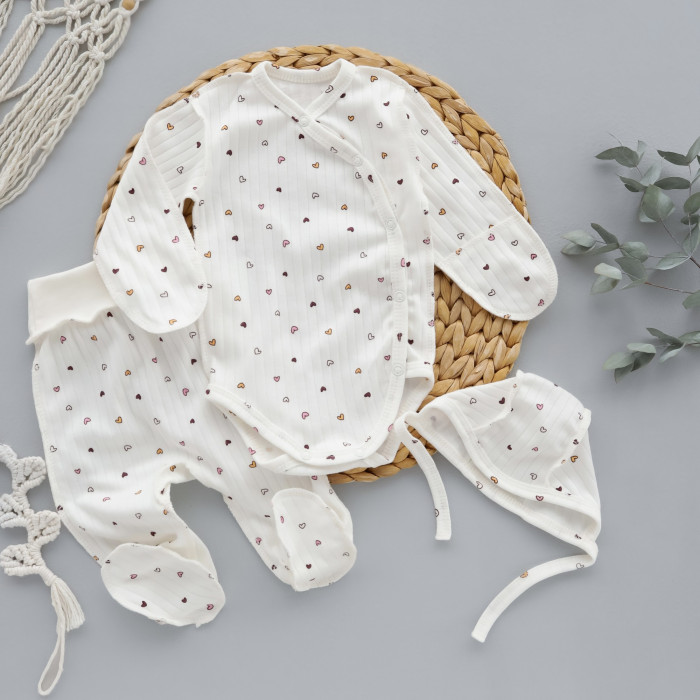 Набір 3в1: Боді, повзунки та шапочка на зав’язках Сердечка дрібні Фіолетовий (Рубчик) 56 (0-1міс)