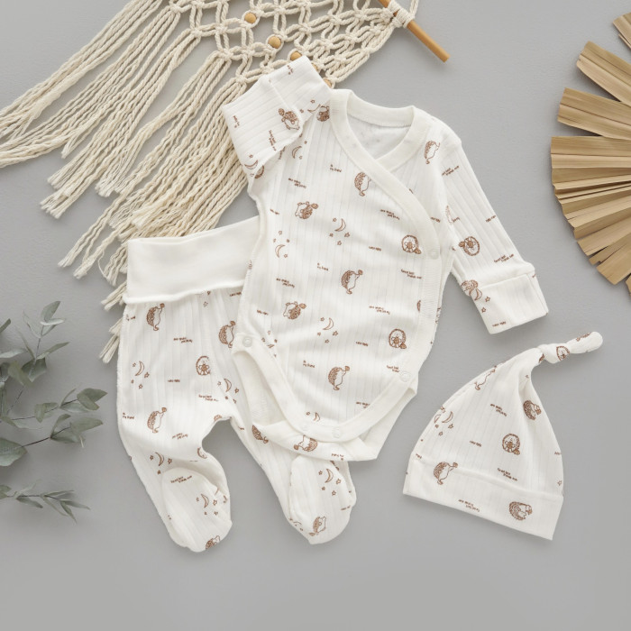 Набір 3в1: Боді, повзунки та шапочка вузлик Їжачки Коричневий (Рубчик) 56 (0-3міс)