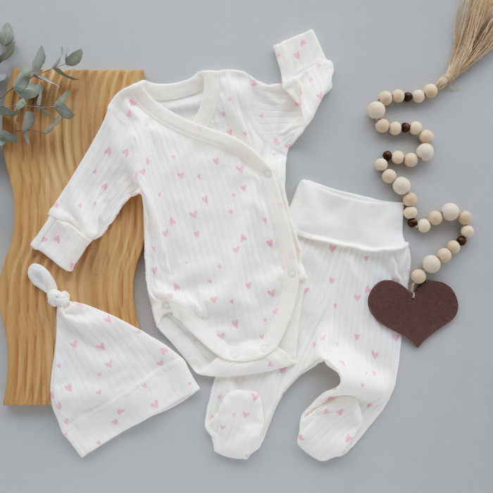 Набір 3в1: Боді, повзунки та шапочка вузлик Сердечка дрібні Рожевий (Рубчик) 56 (0-3міс)