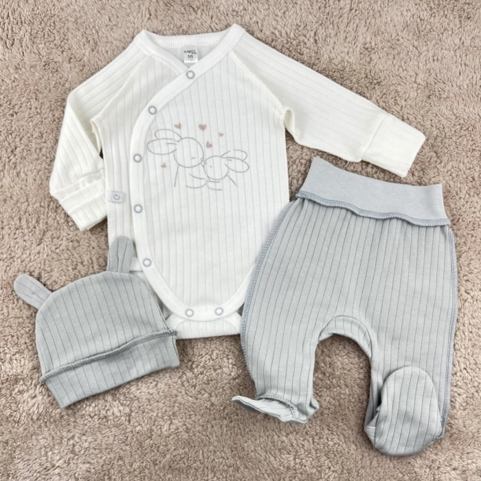 Набір 3в1: Боді, повзунки та шапочка Зайчики Сірий (Рубчик) 62 (3-6міс)