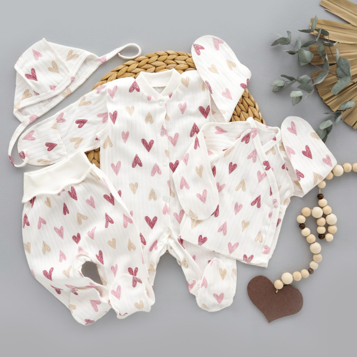 Набір 4в1: Чоловічок, льоля, повзунки та шапочка на зав’язках Сердечка Рожевий (Рубчик) 56 (0-1міс)