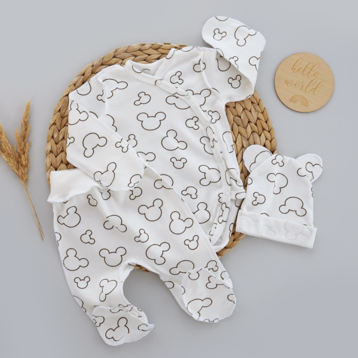 Набір 3в1: Боді, повзунки та шапочка Міккі Молочний (Інтерлок) 56 (0-1міс)