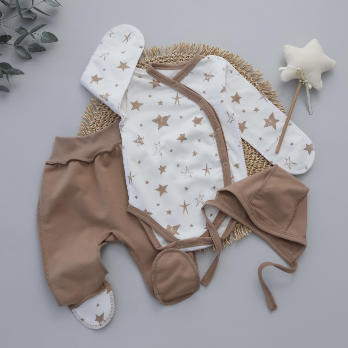 Набір 3в1: Боді, повзунки та шапочка на зав’язках Зірки Кавовий (Футер - з начосом) 56 (0-1міс)