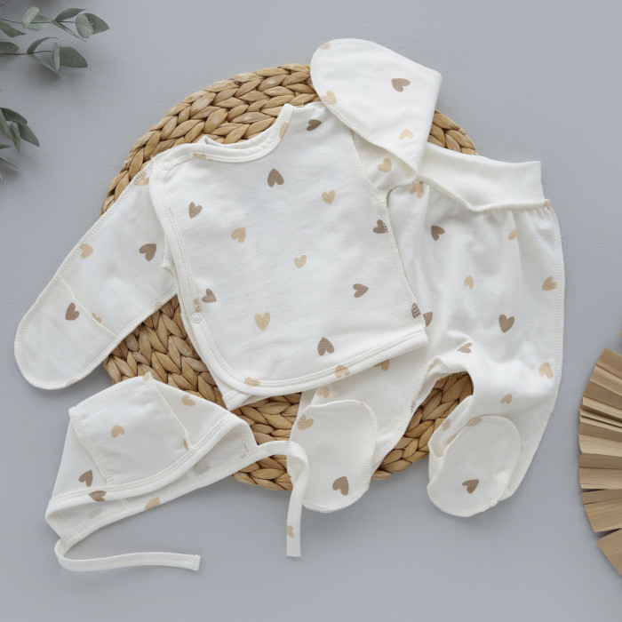 Набір 3в1: Льоля, повзунки та шапочка на зав’язках Сердечка Бежевий (Футер - з начосом) 56 (0-1міс)