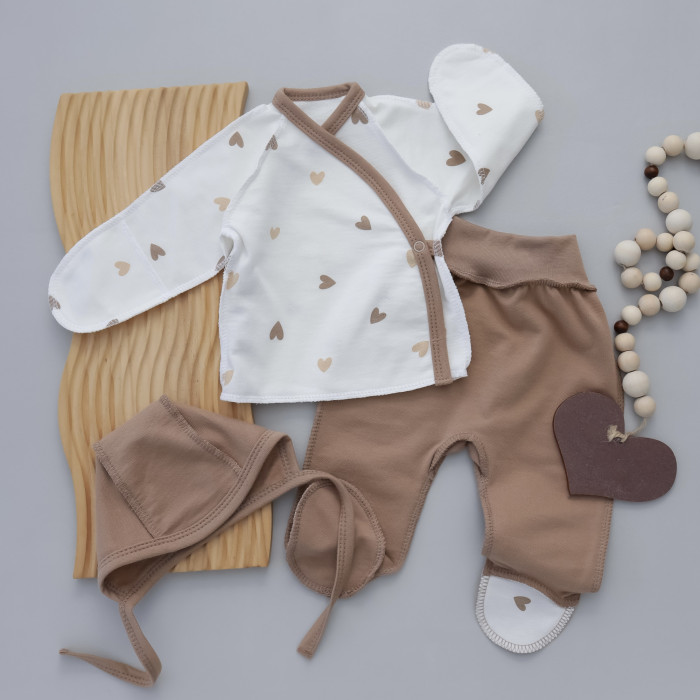 Набір 3в1: Льоля, повзунки та шапочка на зав’язках Сердечка Кавовий (Футер - з начосом) 62 (1-3міс)