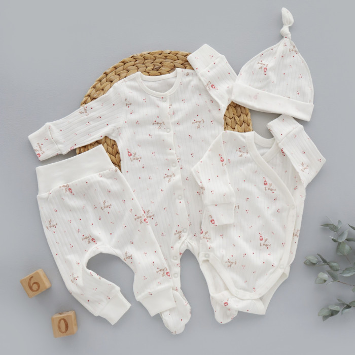 Набір 4в1: Чоловічок, боді, штанці та шапочка вузлик Сердечка Рожевий Je t'aime (Рубчик) 62 (3-6міс)