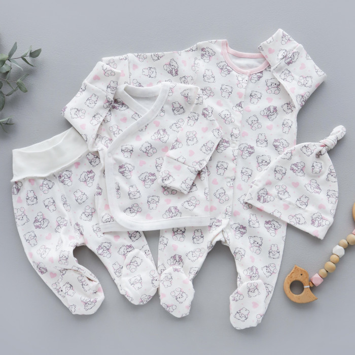 Набір 4в1: Чоловічок, льоля, повзунки та шапочка вузлик Котики Рожевий (Інтерлок) 56 (0-3міс)