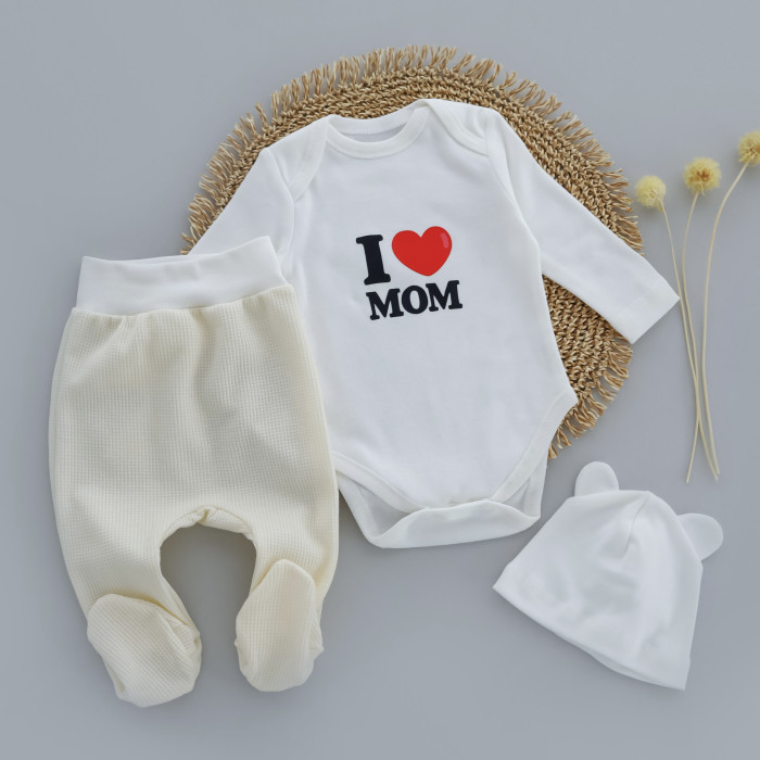Набір 3в1: Боді, повзунки та шапочка I love mom Бежевий (Інтерлок /вафелька) 62 (3-6міс)