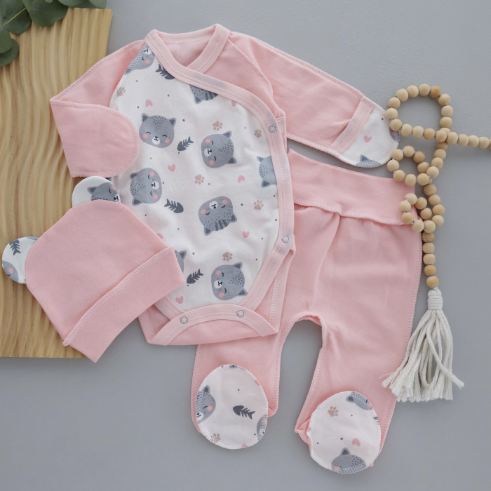 Набір 3в1: Боді, повзунки та шапочка Котики Рожевий (Футер - з начосом) 56 (0-3міс)