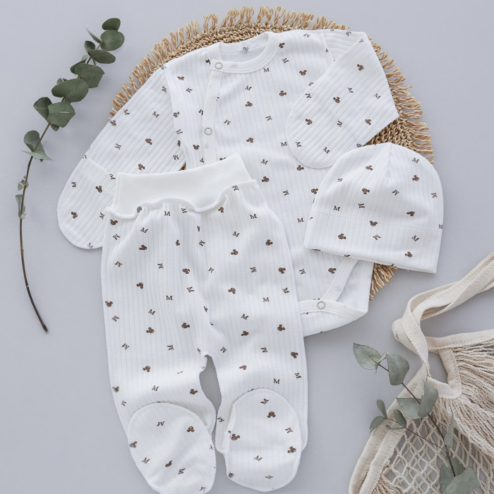 Набір 3в1: Боді, повзунки та шапочка Міккі Молочний (Рубчик) 56 (0-3міс)