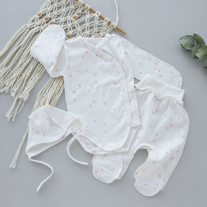 Набір 3в1: Боді, повзунки та шапочка на зав’язках Сердечка на молочному (Рубчик) 56 (0-3міс)
