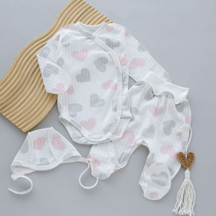 Набір 3в1: Боді, повзунки та шапочка на зав’язках Сердечка великі (Рубчик) 62 (3-6міс)