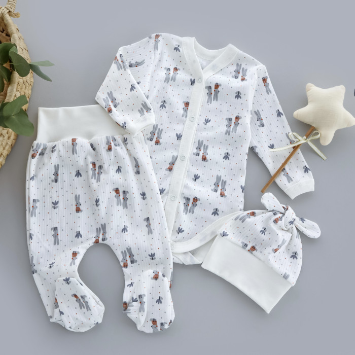 Набір 3в1: Боді, повзунки та шапочка Зайчата Сірий (Рубчик) 62 (3-6міс)