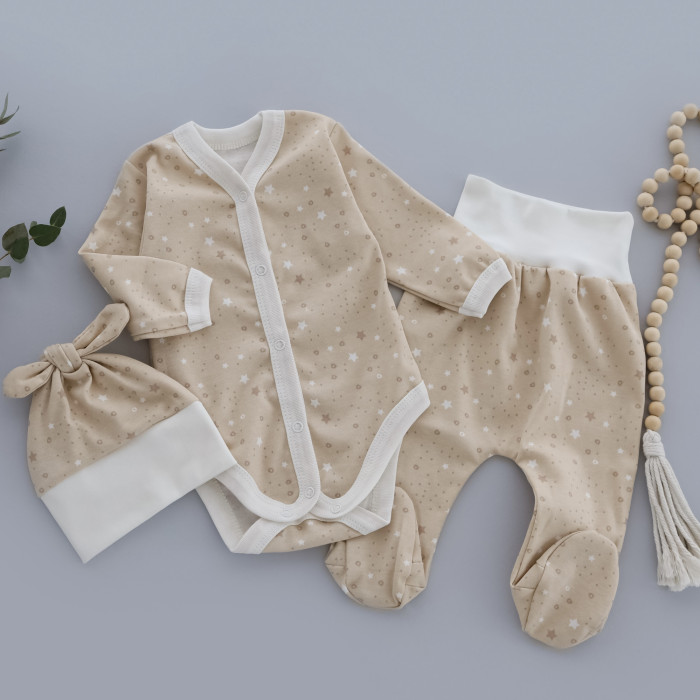 Набір 3в1: Боді, повзунки та шапочка Зірки Бежевий (Інтерлок) 62 (3-6міс)