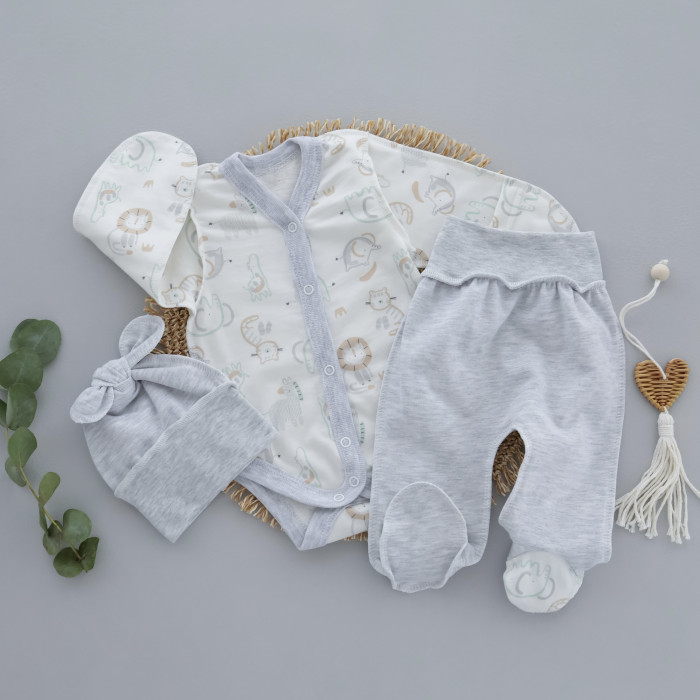 Набір 3в1: Боді, повзунки та шапочка Звірята Сірий (Футер - з начосом) 56 (0-3міс)