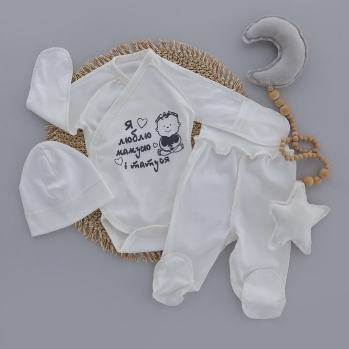 Набір 3в1: Боді-розпашонка, повзунки, шапочка Я люблю матусю і татуся Молочний (Інтерлок) 56 (0-3міс)