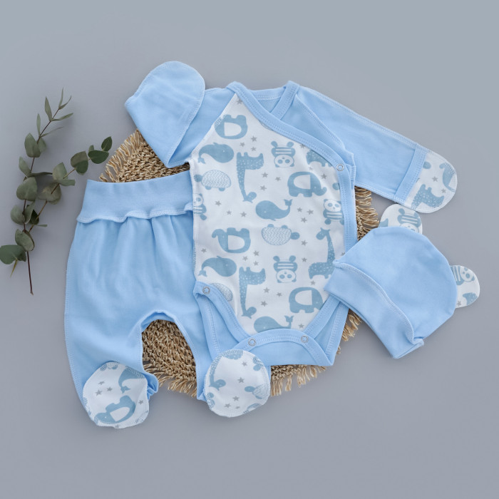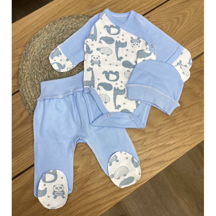 Набір 3в1: Боді-розпашонка, повзунки, шапочка Слоники Блакитний (Інтерлок) 56 (0-3міс)