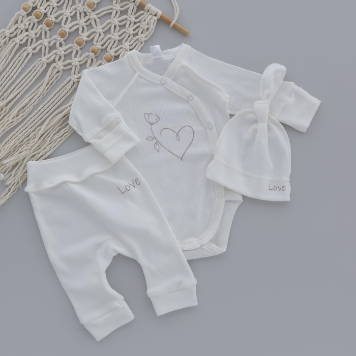 Набір 3в1: Боді, штанці та шапочка Сердечка Молочний (Рубчик) 62 (3-6міс)