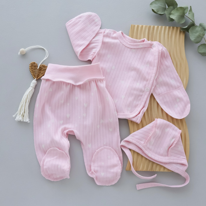 Набір 3в1: Льоля, повзунки та шапочка на зав’язках Сердечка на рожевому (Рубчик) 56 (0-3міс)