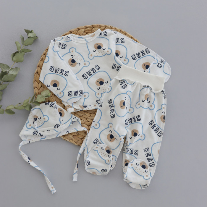 Набір 3в1: Льоля, повзунки та шапочка на зав’язках Ведмедики Блакитний (Футер - з начосом) 56 (0-3міс)