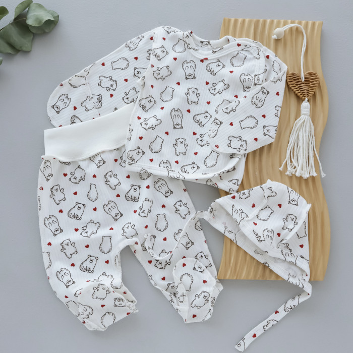 Набір 3в1: Льоля, повзунки та шапочка на зав’язках Ведмедики з сердечками (Рубчик) 62 (3-6міс)