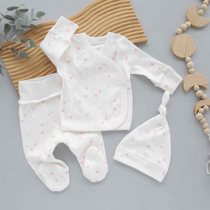 Набір 3в1: Льоля, повзунки та шапочка вузлик Сердечка дрібні Рожевий (Рубчик) 56 (0-3міс)