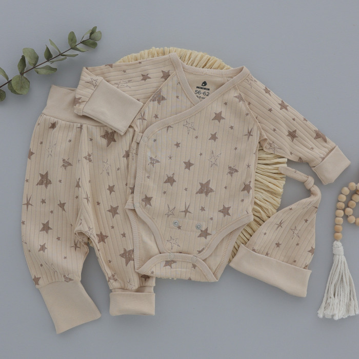 Набір 3в1 зростаючий: Боді, штанці та шапочка Бежевий Зірки (Рубчик) 56-62
