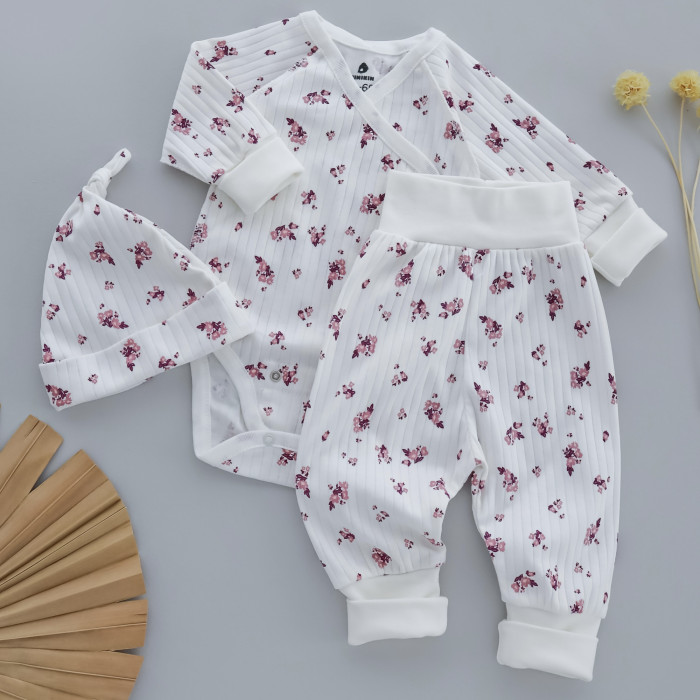 Набір 3в1 зростаючий: Боді, штанці та шапочка Квіти (Рубчик) 62-68