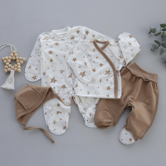 Набір 4в1: Чоловічок, льоля, повзунки та шапочка на зав’язках Зірки Кавовий (Футер - з начосом) 56 (0-1міс)