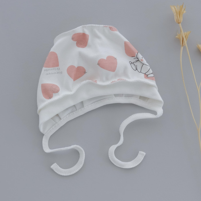 Шапочка на завʼязках Зайчики Сердечка (Інтерлок) 56 (0-3міс)