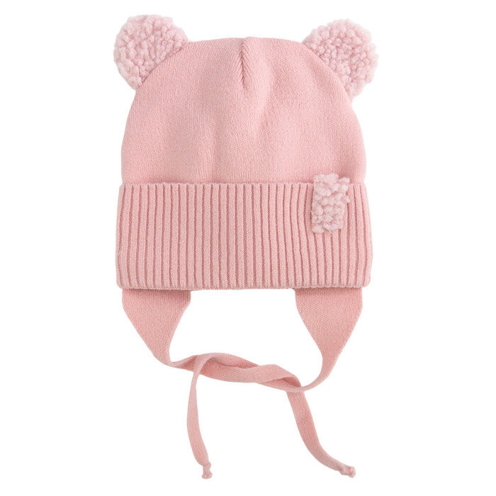 Шапочка в'язана (підклад Фліс) з вушками Тедді Світла Пудра (хол осінь/ тепла зима) 42-44 (6-9міс)