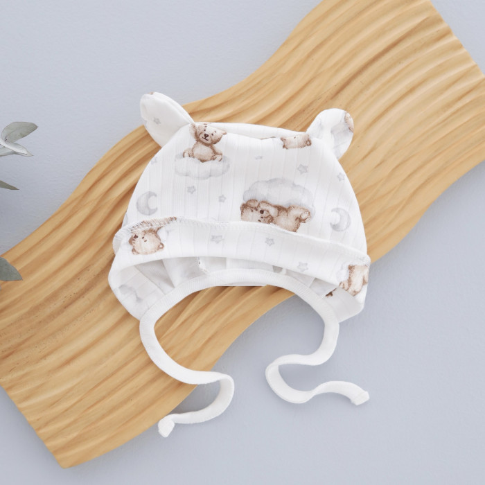 Шапочка на завʼязках з вушками Ведмедик на хмаринці (Рубчик) 56 (0-3міс)