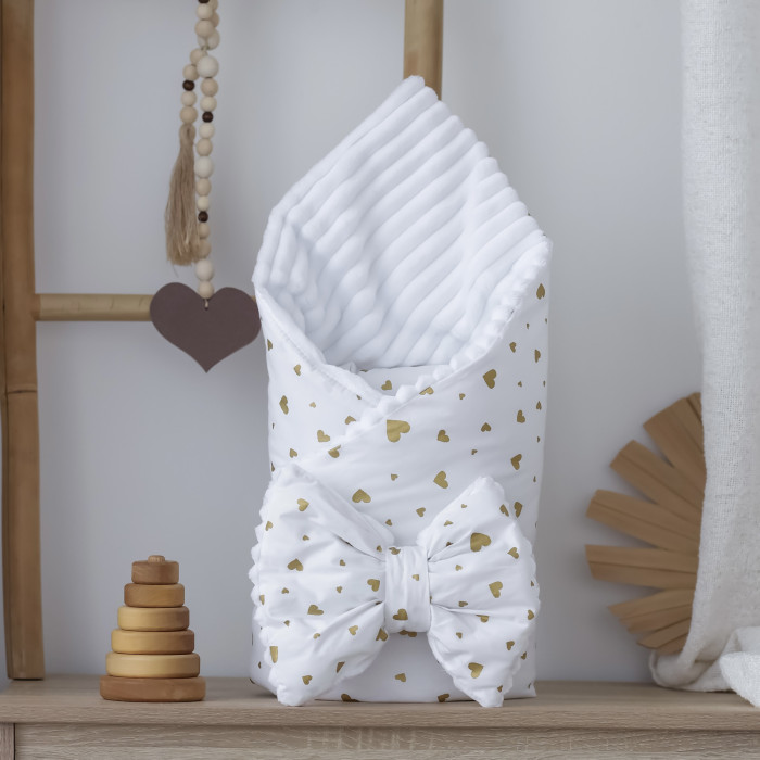Плед зі зʼємним утепленням банта -резинки Сердечка Золотий (гліттер) /Білий плюш 90/80