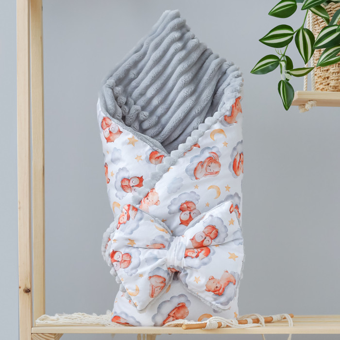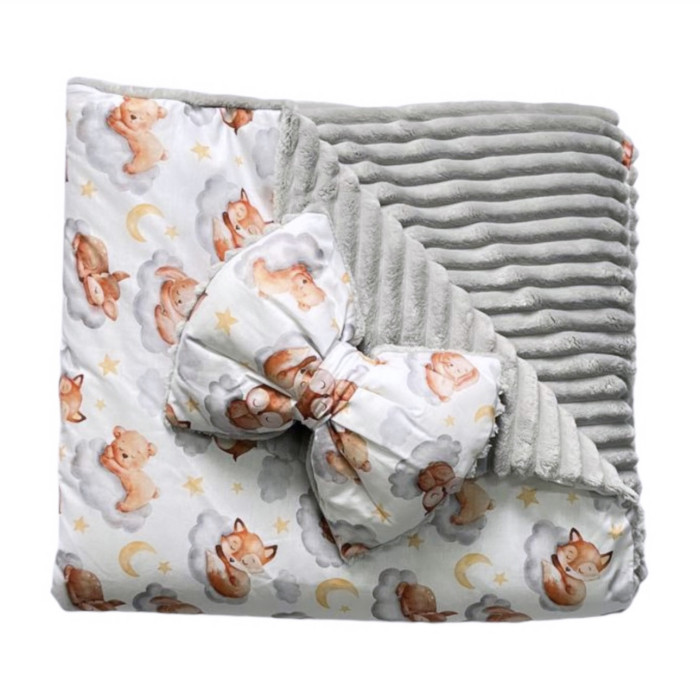 Плед зі з‘ємним утеплювачем та бантом-резинкою Лисички на хмаринці /Сірий плюш 90/80