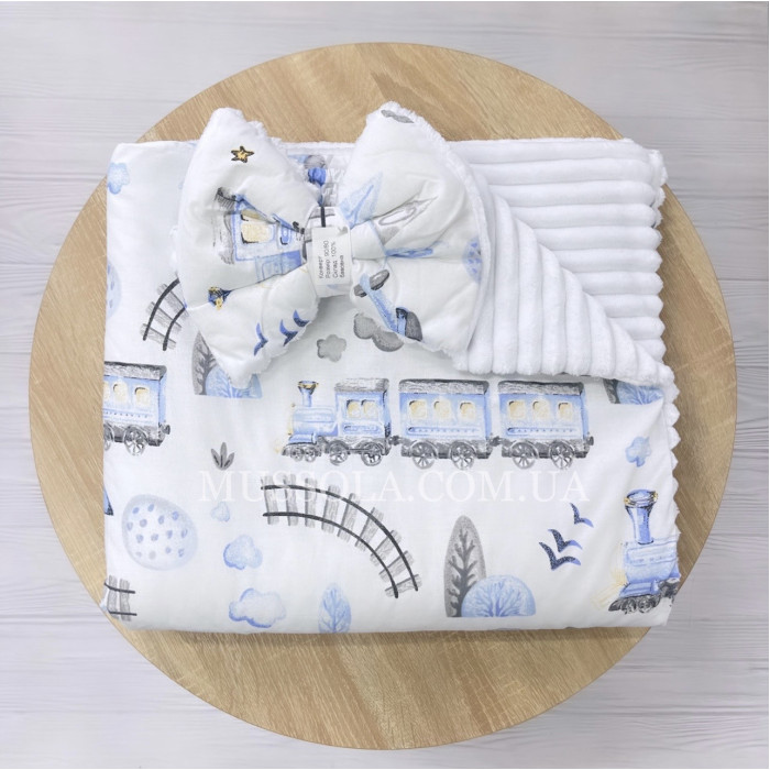 Плед зі з‘ємним утеплювачем та бантом-резинкою Потяг Блакитний /Білий плюш 90/80