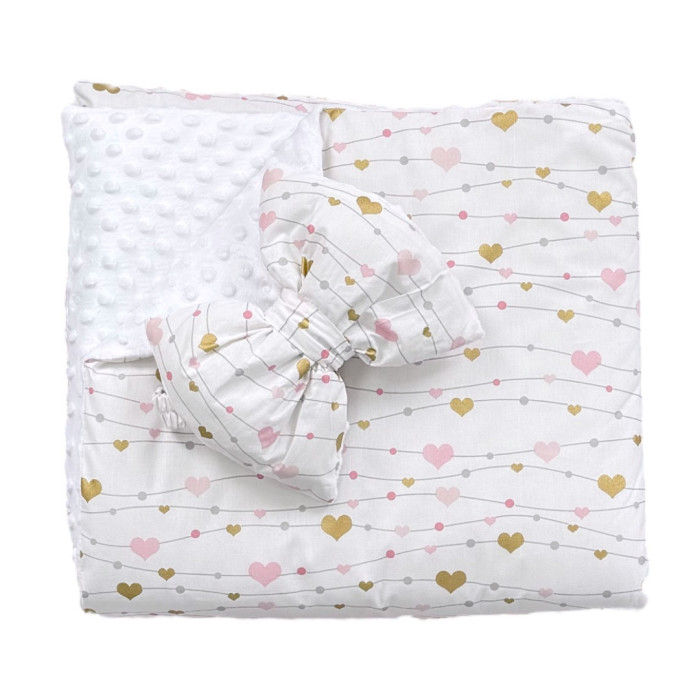 Плед зі зʼємним утеплювачем та бантом-резинкою Сердечка Рожевий - Золото (гліттер) / Білий плюш пупиришка 90/80