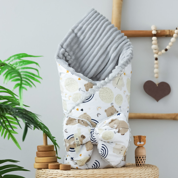 Плед зі з‘ємним утеплювачем та бантом-резинкою Ведмедик Бежевий/ Сірий плюш 90/80