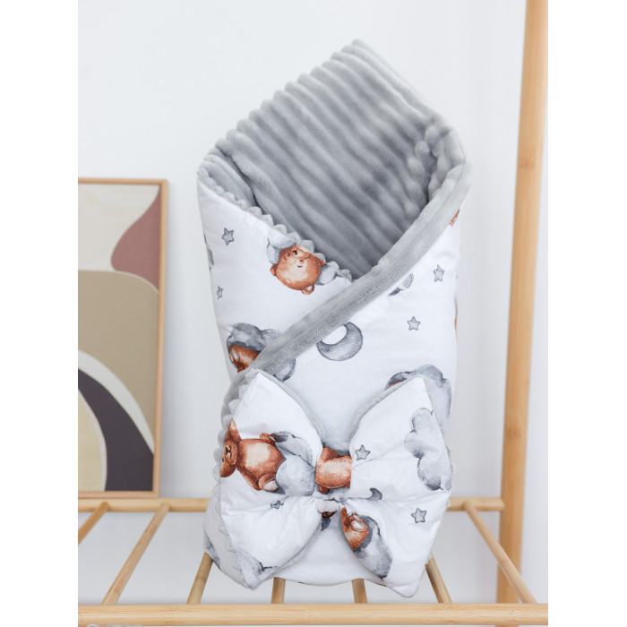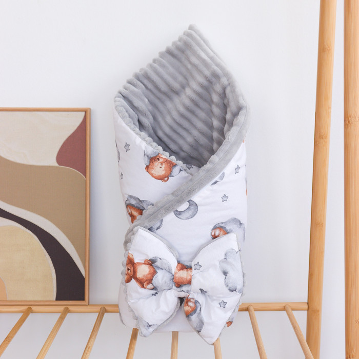 Плед зі з‘ємним утеплювачем та бантом-резинкою Ведмедик Коричневий на хмаринці/ Сірий плюш 90/80