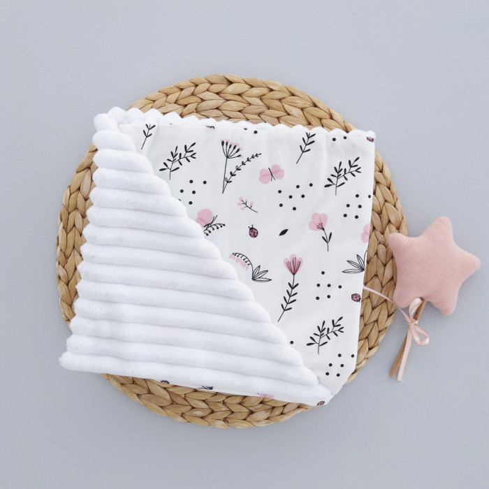 Плед плюш, без утеплення Квіточки Рожевий/ Білий плюш 100/80