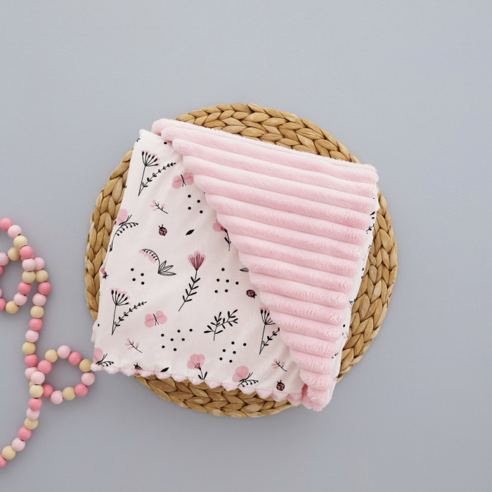 Плед плюш, без утеплення Квіточки Рожевий/ Рожевий плюш 100/80