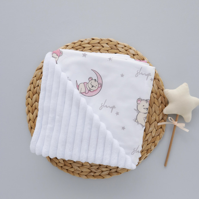 Плед плюш, без утеплення Ведмедик Місяць Рожевий/ Білий плюш 100/80