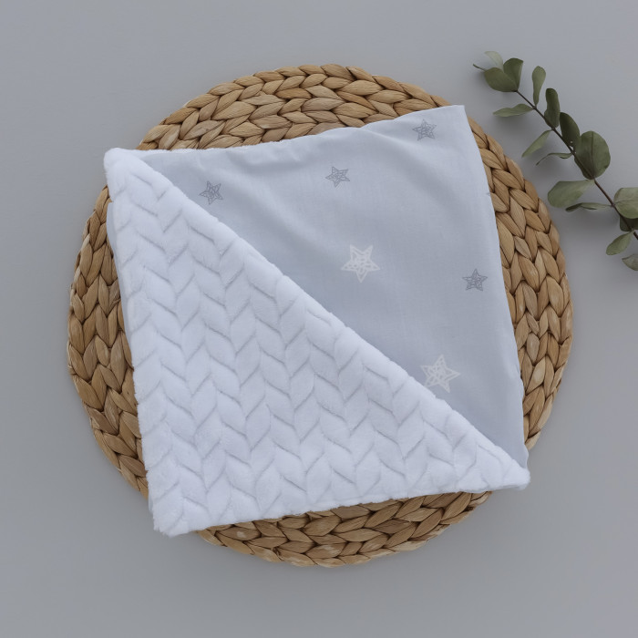 Плед плюш, без утеплення Зірки на Сірому/ Білий плюш косичка 100/80