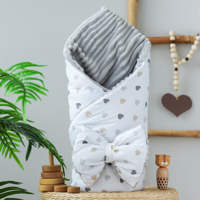 Плед зі з‘ємним утеплювачем та бантом-резинкою Сердечка Бежевий / Сірий плюш 90/80