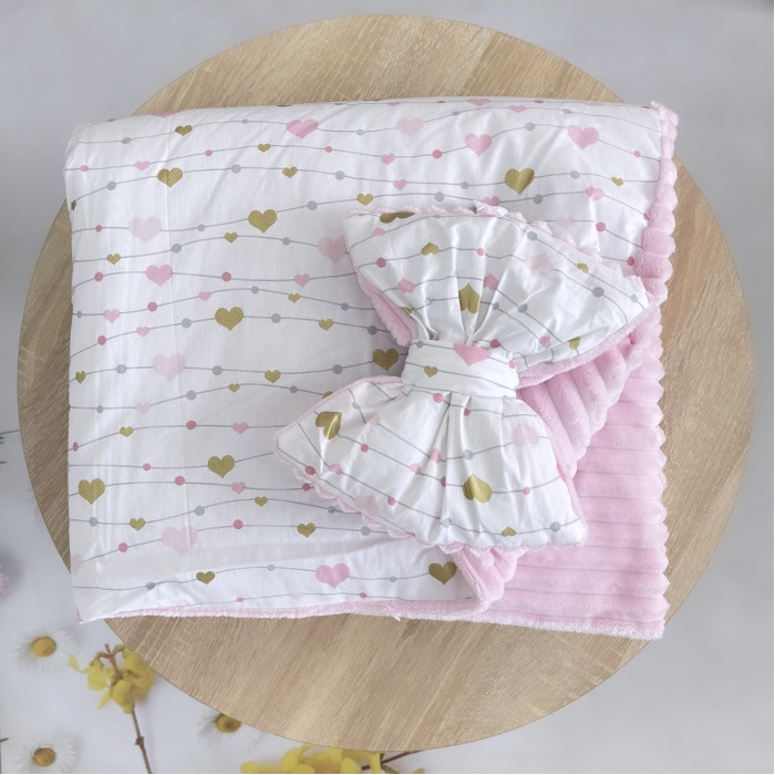 Плед зі з‘ємним утеплювачем та бантом-резинкою Сердечка Рожевий - Золото (гліттер) / Рожевий плюш 90/80