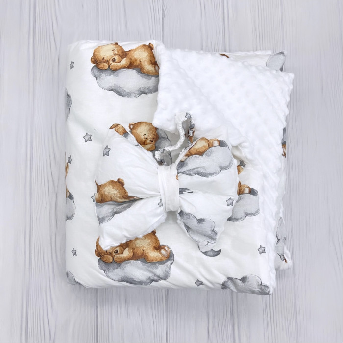 Плед зі з‘ємним утеплювачем та бантом-резинкою Ведмедик Коричневий на хмаринці/ Білий плюш пупиришка 90/80