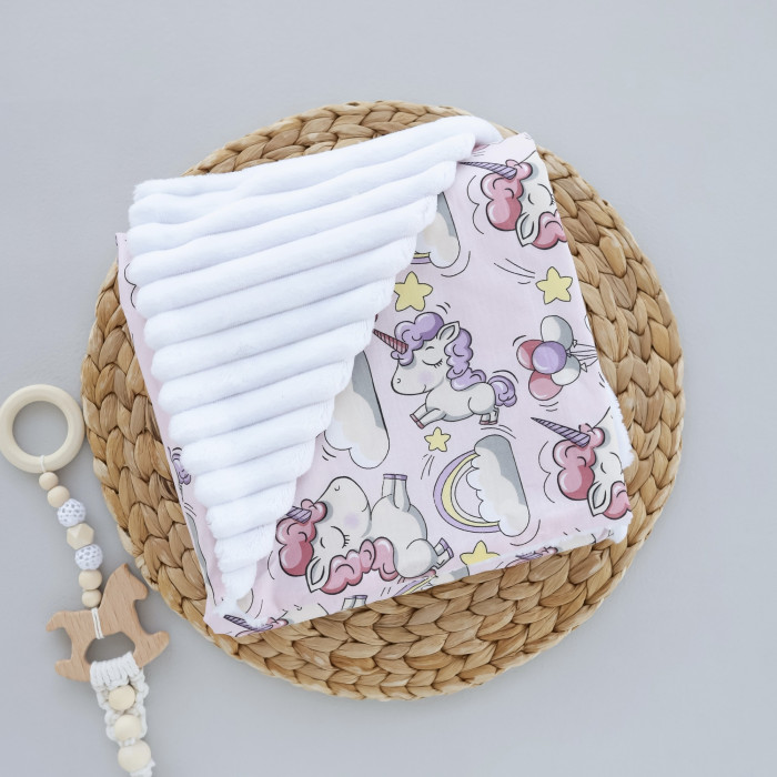 Плед плюш, без утеплення Единоріжки Рожевий / Білий плюш 100/80