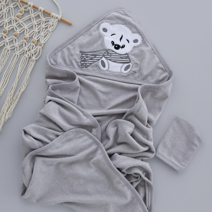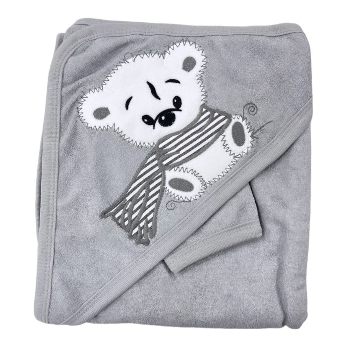 Дитячий рушник з кутиком махровий Ведмедик з шарфом Сірий 90/85